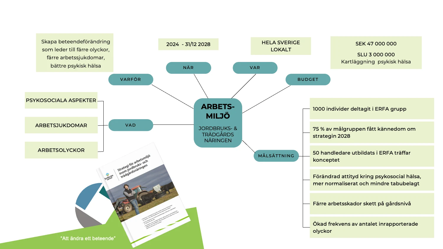 Under åren kommer ett flertal insatser att göras, bland annat erfarenhetsträffar, utbildningar, informations- och kampanjinsatser, däribland en årlig arbetsmiljövecka. Målet är att till 2028 få ner antalet arbetsskador och göra diskussionen kring psykosocial hälsa mindre tabubelagt i branschen. Allt för att skapa hållbarhet i näringen med fler attraktiva företag och arbetsplatser.